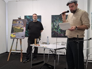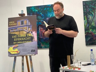 Doppellesung im Kunstraum 44 In Kelkheim: Szennen rund um die Kunst aus "Gemeinsam gegen Einsam: Haltestelle Zukunft" und Auszüge aus Stefan Katgelies Krimi aus dem Kunstmilieu " Die Farbe der Eifersucht"