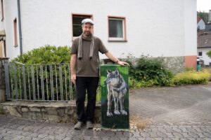 Es gehe in die zweite Runde, freute sich Bürgermeister Alexander Simon. Zu den bereits zehn künstlerisch gestalteten Verteilerkästen im Eppsteiner Stadtgebiet, kommen nun fünf weitere, in jedem Stadtteil einer. Gestaltet haben sie wieder Künstlerinnen und Künstler der Künstlergruppe „Zusammenkunst“, diesmal aber andere als im Vorjahr. Axel Jung hat sich einen großen Kasten am Stadtbahnhof Eppstein und einen in Ehlhalten vorgenommen und mit Wölfen verziert. „Das passt sich gut ein, denn der Blick fällt direkt auf dem Wald des Bergparks dahinter“, lobte Simon. Für die gestalteten Wölfe mit ihren Jungen habe er sich von einem Rudel in der Fasanerie in Wiesbaden inspirieren lassen, erzählte Jung. Florian Bienias vom Netzbetreiber Syna hatte mit Simon die Stromkästen ausgesucht. „Schnöde Kästen werden zur Stadtarchitektur mit ganz individuellen Motiven“, so Bienias. Er habe durch das Projekt in Eppstein gute Kontakte zu Künstlerinnen und Künstlern erhalten, und es gäbe auch Folgeprojekte. In Bremthal in der Wiesbadener Straße würden bald Seerosen zu sehen seien, versprach Ute Damm. Sie habe bereits die Grundierung aufgetragen, aber im Moment sei es zu heiß zum Arbeiten. Bereits fertig ist die Fotokünstlerin Yvonne Winterer, die mit ihrem Fachwerkmotiv einen Kasten in Niederjosbach gestaltet hat. In Vockenhausen gibt es neuerdings einen Leuchtturm, den die Künstlerin Kornelia Ungeheuer auf einen Verteilerkasten gezaubert hat. Alle Künstler haben honorarfrei gearbeitet und etliche Stunden dafür gebraucht. Farben und Materialien hat ihnen die Bürgerstiftung finanziert, die wiederum auch eine Spende von der Syna für das Projekt erhielt. Die Vorsitzende Christina Cantzler betonte, dass die Bürgerstiftung das Projekt gern unterstütze. „Die gestalteten Kästen erfreuen die Vorbeikommenden und verschönern unser Stadtbild“. Organisiert hatte die Gestaltung der Kästen die Mitarbeiterin des Stadtarchivs Sonja von Saldern, die sich froh darüber zeigte, wieder Künstlerinnen und Künstler für das Projekt gefunden zu haben.