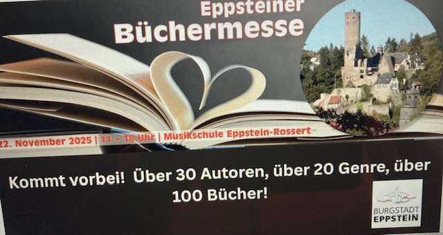 Das gab es noch nie- eine Buchmesse im beschaulischen Eppstein. Jetzt ist es soweit. Am 22. November 2025 findet die 1. buchmesse Eppsteins statt. Autorin Brina Stein hat diese außerordentlich Veranstaltung gemeinsam mit der Stadt Eppstein organisiert. Ich freue mich, mit dem Tuschel- Verlag mit dabei zu sein.
